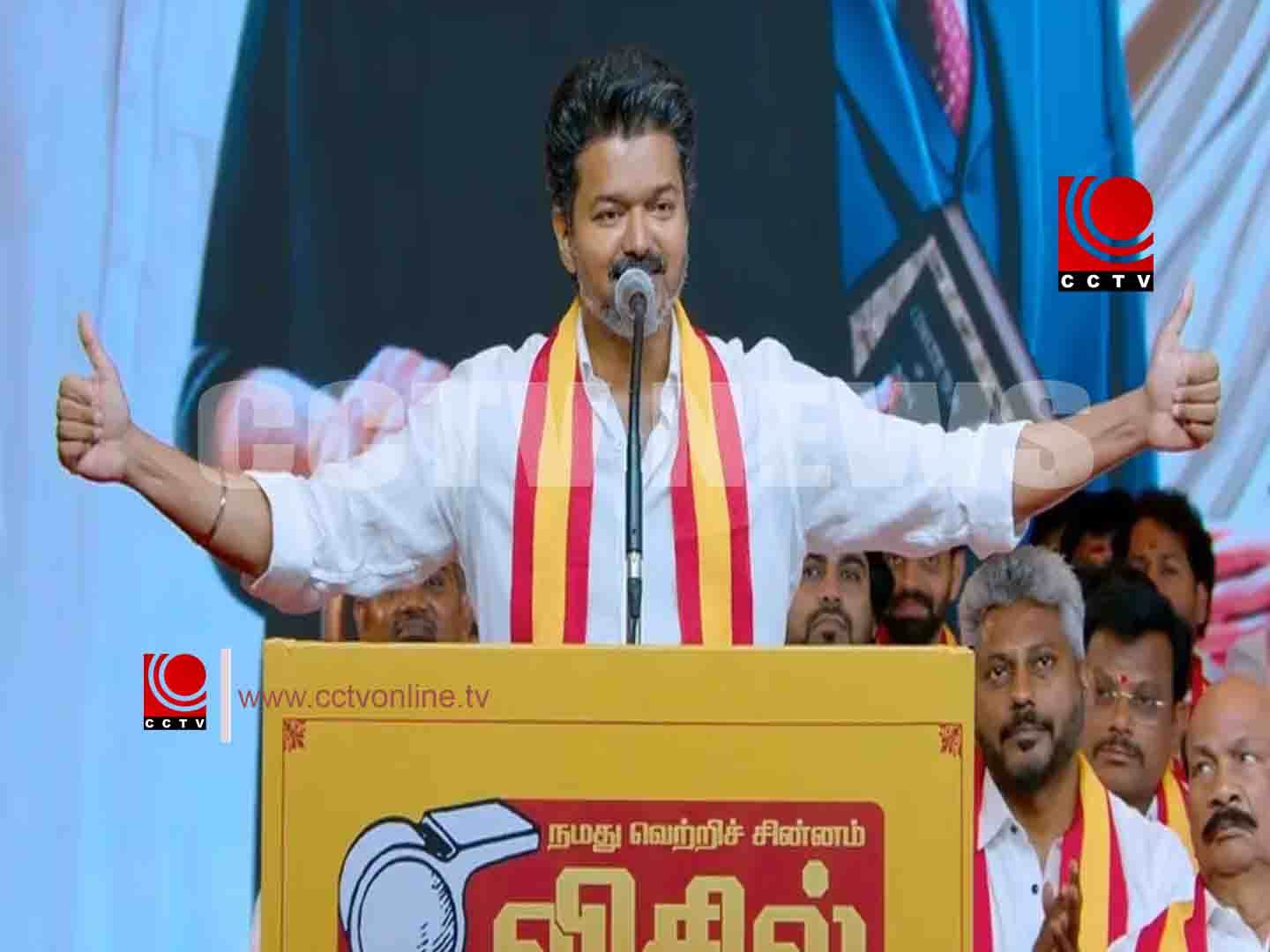 ഒരു അവസരം നല്‍കണമെന്ന് സ്ഥാനാര്‍ത്ഥികളുടെ പേരുകള്‍ പ്രഖ്യാപിച്ചുകൊണ്ട് വിജയ് ജനങ്ങളോട് അഭ്യര്‍ത്ഥിച്ചു. ‘വിസിലിന് വോട്ട് ചെയ്യുക, ഇത് വിസില്‍ വിപ്ലവ തിരഞ്ഞെടുപ്പാണ്’ അദ്ദേഹം തന്റെ പാര്‍ട്ടിയുടെ തിരഞ്ഞെടുപ്പ് ചിഹ്നത്തെ ഉയര്‍ത്തിക്കാട്ടി പറഞ്ഞു.